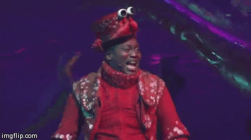 Cameron then steps in front of his fishy back up dancers. He's got his guitar, and a couple of friends [volunteers?] accompanying him, and without further hesitation, launches into song.